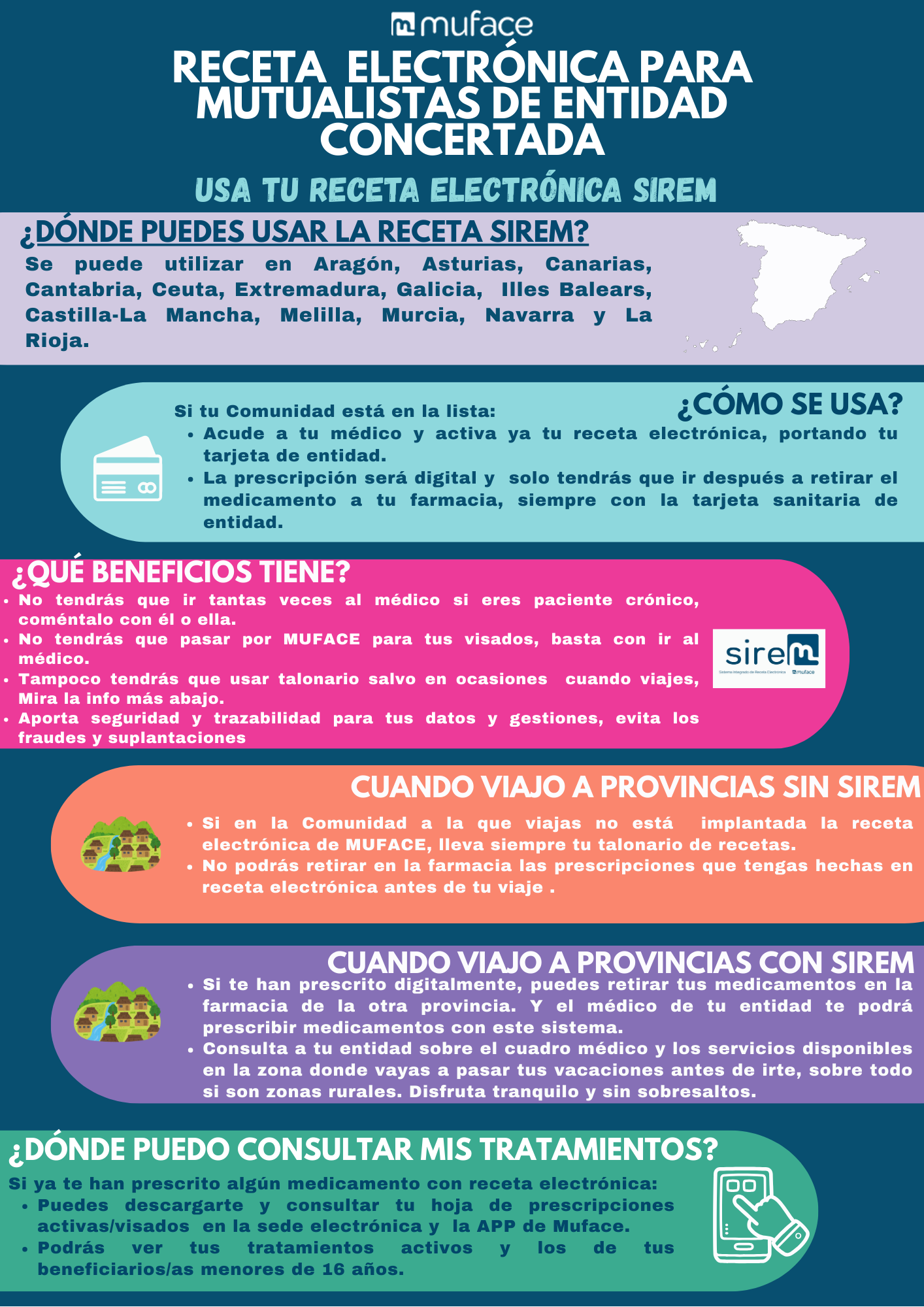 El 4 de mayo de 2020, por primera vez en España en un ámbito de colaboración público-privada, se puso en marcha en Cantabria el sistema de receta electrónica de MUFACE, denominado SIREM. En marzo de 2022 se inicia la implantación de la receta electrónica concertada en el Principado de Asturias, también en el ámbito de prescripción de las tres entidades que suscribieron el Concierto 2022-2024 con MUFACE. El 23 de noviembre de 2022 se pone en funcionamiento la receta electrónica para mutualistas de concertada en Canarias, donde el beneficio es si cabe mayor, por el hecho insular.